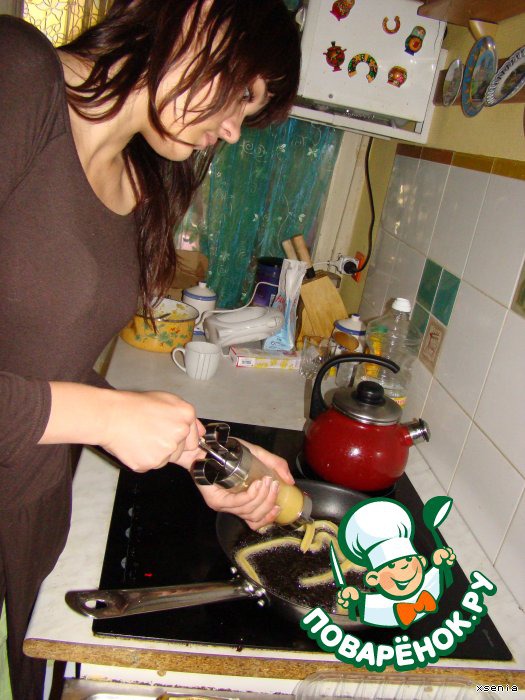 Тестом наполняем кондитерский шприц. На сковороде хорошо нагреваем растительное масло. ВНИМАНИЕ: Масло должно быть раскаленным, иначе у вас печенье тоже получится жирным и невкусным. С помощью шприца тесто отсаживаем прямо на сковороду в раскаленное масло. Если надо, переверните.