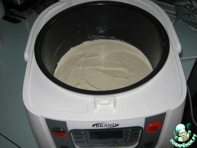 Чашу мультиварки смазываем сливочным маслом и ложкой постепенно выкладываем массу, вываливать всё сразу не надо. Включаем режим "выпечка" на 1 час. После сигнала мультиварку отключаем и не открываем 40-50 минут. В процессе выпечки мультиварку открывать нельзя, иначе осядет.