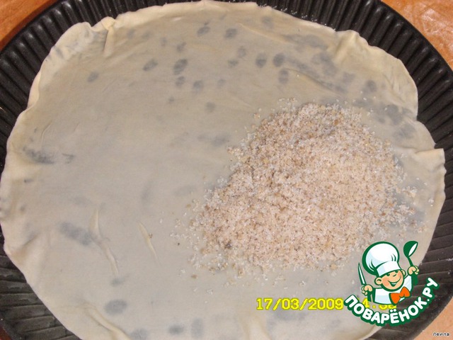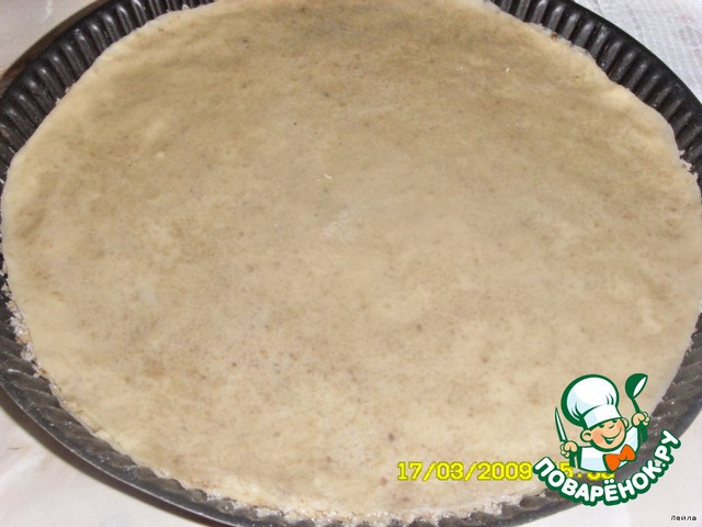 Смазать форму маслом,выложить пласт теста,насыпать начинку(2-2,5 ст.л.)