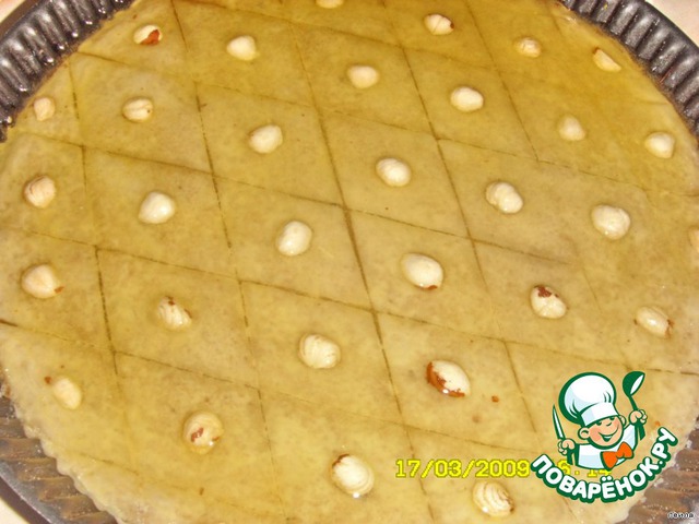 Нарезать в форме пахлавы, украсить фундуком (прежде чуть обжарить, очистить, разрезать на 2 дольки), смазать яичным желтком, смешанный шафраном или лучше с шепоткой куркумы, и равномерно полить растопленным топленым маслом. Положить выпекать пахлаву в разогретую духовку при t=180* на 35-40мин.