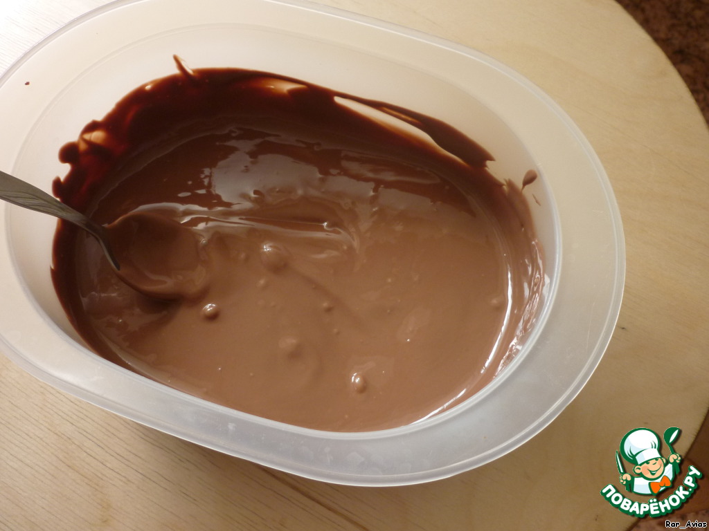 Растапливаем шоколад в микроволновке (ломаем на мелкие кусочки и ставим на 30 секунд, перемешиваем и ставим еще на 30 секунд)