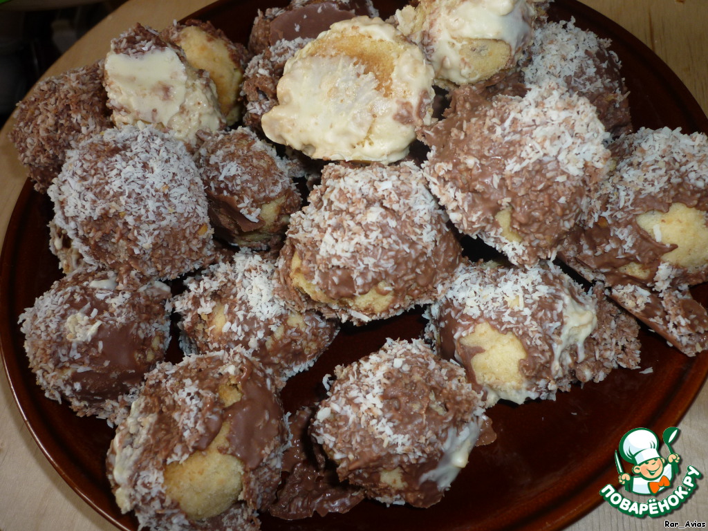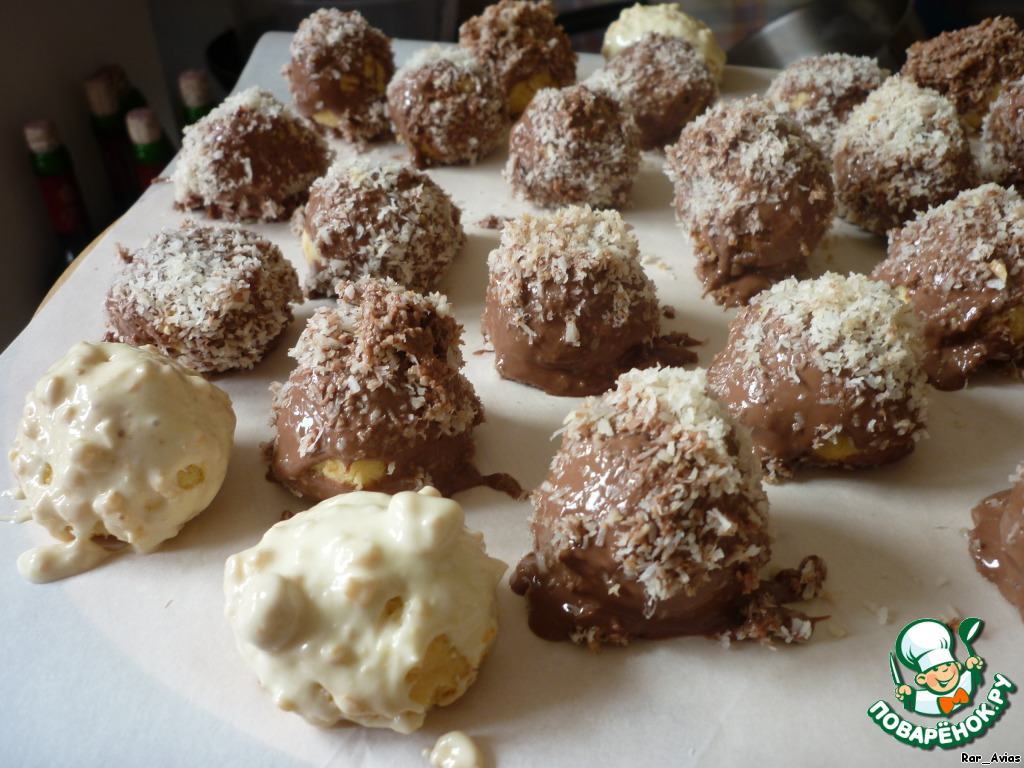 Поливаем шарики шоколадом и обваливаем в кокосовой стружке