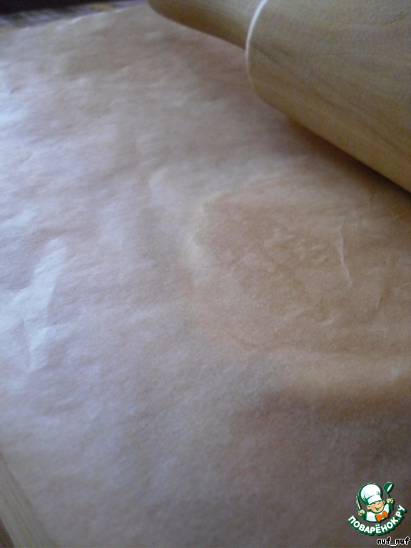 Разогреть духовку до 160 градусов. Противень застелить бумагой для выпечки. Раскатать тесто между двумя слоями бумаги для выпечки толщиной около 1 см.