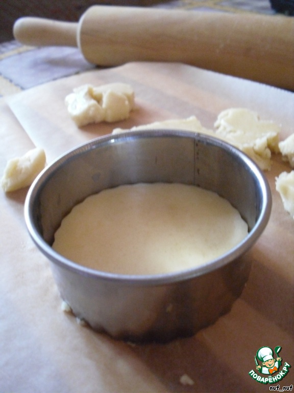 Вырезать формой круг диаметром 6-7 см. Форму не вынимать!!!Осторожно перенести на противень. Выпекать вместе с формой 12-15 минут при температуре 160 градусов.