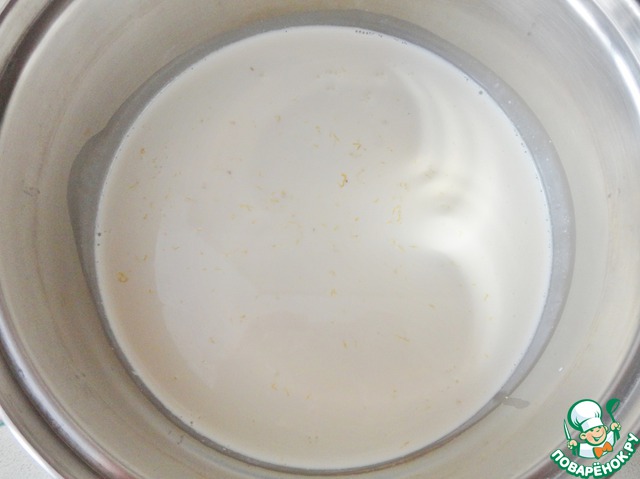 В кастрюлю наливаем молоко, сливки и добавляем лимонную цедру. Ставим на огонь.