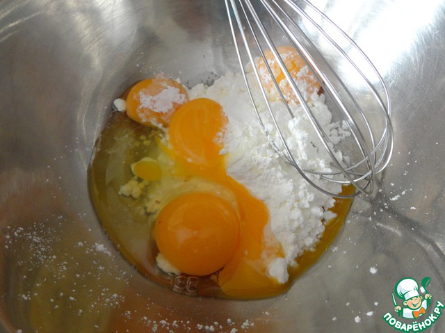 В мисочке венчиком взбиваем 1 целое яйцо и 3 желтка с сахаром и кукурузным крахмалом.