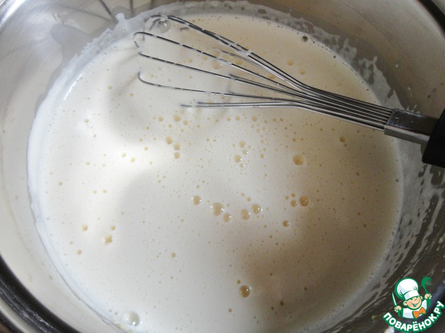 Как только молоко начнет закипать, добавляем примерно его треть в мисочку с яйцами, постоянно помешивая смесь.