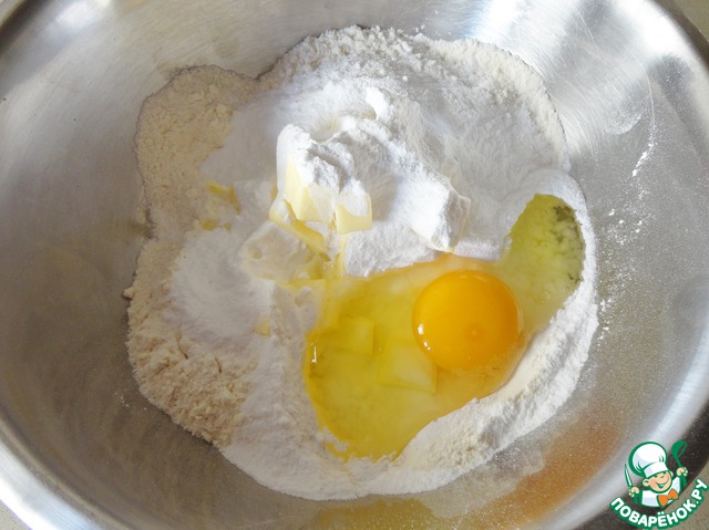 Для теста соединяем 250г муки, 125г холодного масла, порезанного кубиками, 90г сахарной пудры и 1 яйцо. Замешиваем тесто. Можно сделать это миксером, используя насадку лопатка.