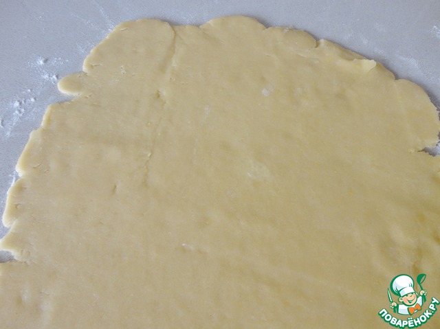 Прогреваем духовку до 170 градусов. Раскатываем тесто на слегка присыпанной мукой поверхности в тонкий пласт.