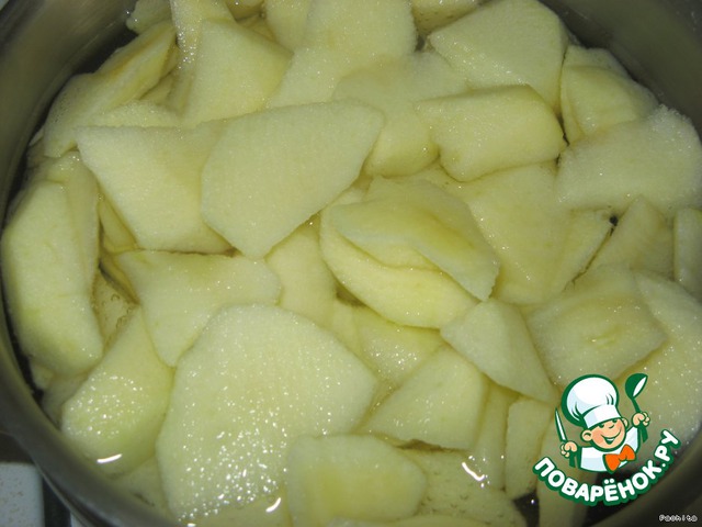 Яблоки вымыть, очистить от шкурки, удалить сердцевину, нарезать кусочками, поместить в кастрюлю и, залив водой, тушить на слабом огне до мягкости.