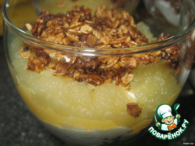 | Этот десерт относится к скандинавским блюдам. Легко готовится. Нежное сочетание взбитых сливок и яблочного пюре с хрустящими карамельными хлопьями. |