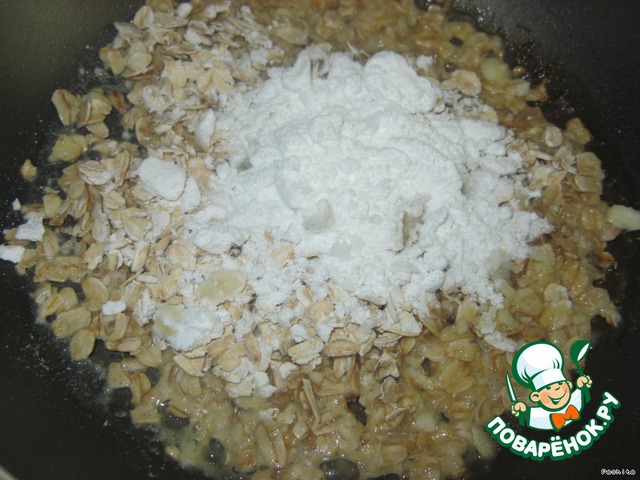 Овсяные хлопья и оставшуюся сахарную пудру, постоянно помешивая, обжарить до состояния хрустящей карамели.