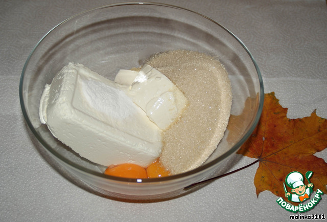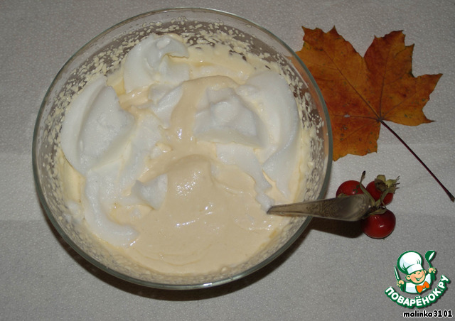 Смешать миксером творог, сметану, желтки, сахар, разрыхлитель