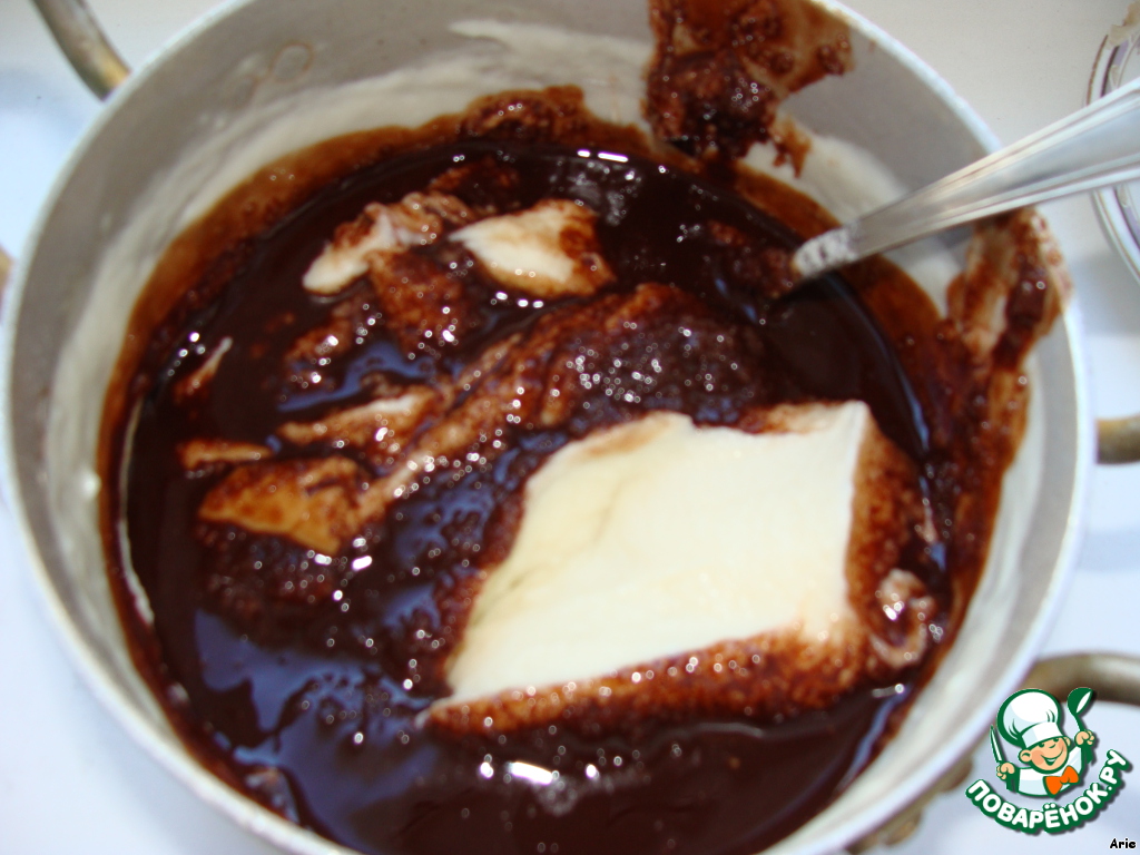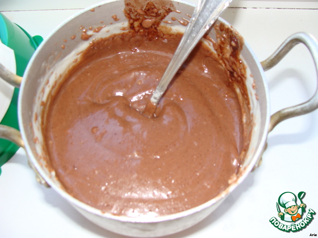 Замешиваем тесто на темные коржи. Смешиваем 2 яйца, банку сгущенного молока, 1ч.л. соды (погашенной), 1 стакан муки, 2 ложки какао. Можно вместо какао и сгущенки положить банку сгущенного какао.