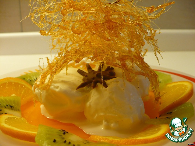 | Честно говоря, была удивлена, когда в поиске не нашла такого простого и эффектного оформления практически любого блюда. Поэтому пользуйтесь, дорогие поварята! У меня сегодня мороженое, а Вы можете в паутинку положить любой десерт, или сверху на тортик. А если паутинку подкислить, то и на рыбку! Почему нет? В общем, безумствуйте, вперед! |