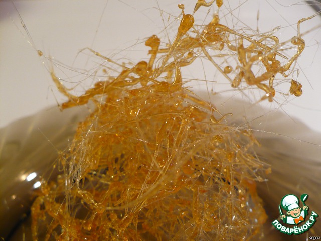 Теперь карамель - сахар+лимонный сок разогреваем на сковороде до золотистого цвета, снимаем с огня, ждем, пока слегка загустеет. Ну а теперь вилку (или венчик) обмакиваем в карамель и когда видим, что она уже не капает, а начинает тянуться, быстрыми движениями (только очень уж активно венчиком не размахивайте - запутаетесь в паутине) наносим карамель на половник и вилки. Забыла сказать - вилки и половник смазываем растительным маслом, чтобы легко отошла карамель. В общем, творим. Признаюсь честно - нужна некоторая сноровка и практика. С половника снимаем кокон, а с вилок сетку и сооружаем вот такую башню.