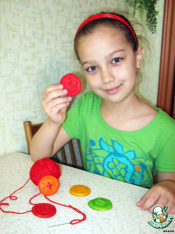 | Печенье — небольшое кондитерское изделие, выпеченное из теста. К тесту для печенья иногда добавляют различные зeрна; печенье обычно формуют в виде кружков, квадратов, звeздочек, трубочек; иногда печенье делают с начинкой (шоколадом, изюмом, сгущeнным молоком, кремом) или помещают начинку между двумя печеньями. Я решила сделать печенье в форме пуговиц. Детям очень понравится такая необычная форма. |