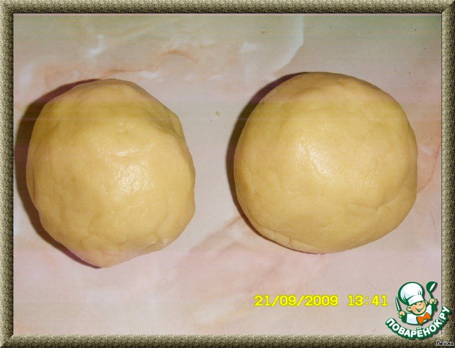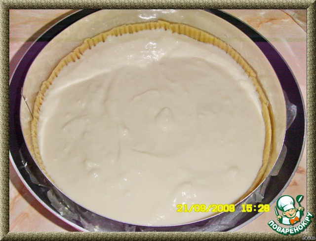 По истечению времени, достать тесто и раскатать два диска.Раскатывайте тесто тонко. Чтобы потом результат не был грубым. Первый диск выложить на дно формы. Хорошо пройдитесь по краям! И выложить готовый крем на поверхность диска.Много сильно не кладите, чтобы за пределы бортов не выходил.