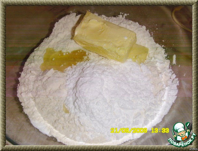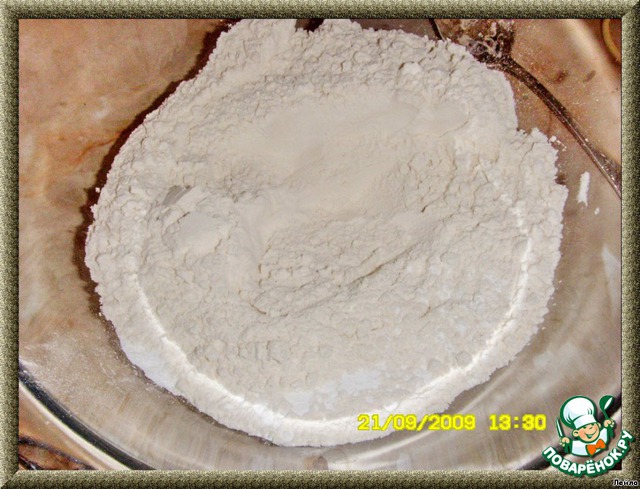 Смешать просеянную муку с разрыхлителем и высыпать на стол( в чашку).
