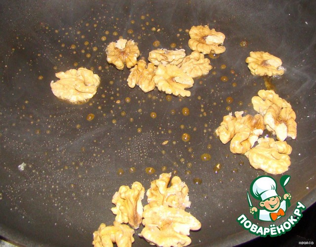 Если вы хотите украсить грецкими орехами...советую их обжарить предварительно в карамели...для этого столовую ложку сахара..нагрейте на сухой сковородке...когда сахар расплавится..обжарьте в нем орехи...буквально минуту..постоянно помешивая