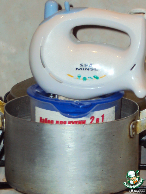 Поставить ёмкость с белками на водяную баню и взбить до густой пены. Затем, не переставая взбивать миксером, подсыпать 4 ст.л. сахара постепенно.