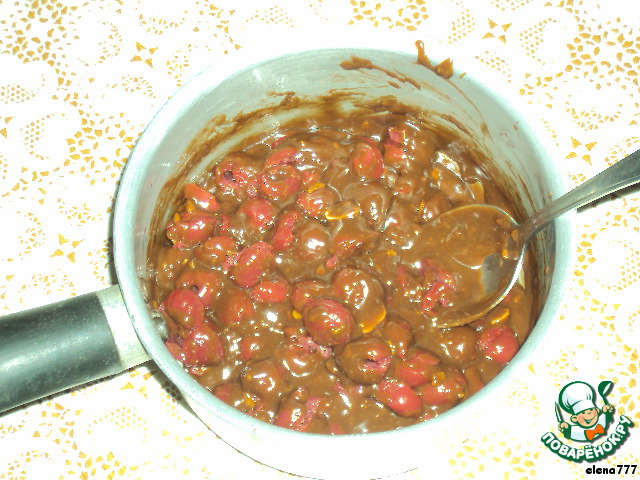 Вишня у меня была в собственном соку без косточек. Можно взять замороженную. Не размораживая, засыпать вишню небольшим количеством сахара и проварить 5 минут. Образовавшийся сок отжать. Всыпать вишню в шоколадную массу и перемешать.