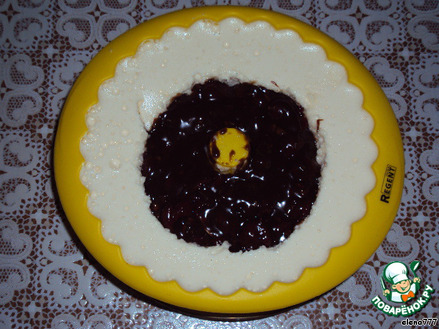 Из застывшего суфле вынуть ложкой серединку, не захватывая низ (вынимать аккуратно, суфле очень нежное и воздушное). Заполнить середину шоколадно-вишнёвой массой, половину вынутого суфле чуть подтопить и залить сверху вишню в шоколаде. Поставить на холод на час.