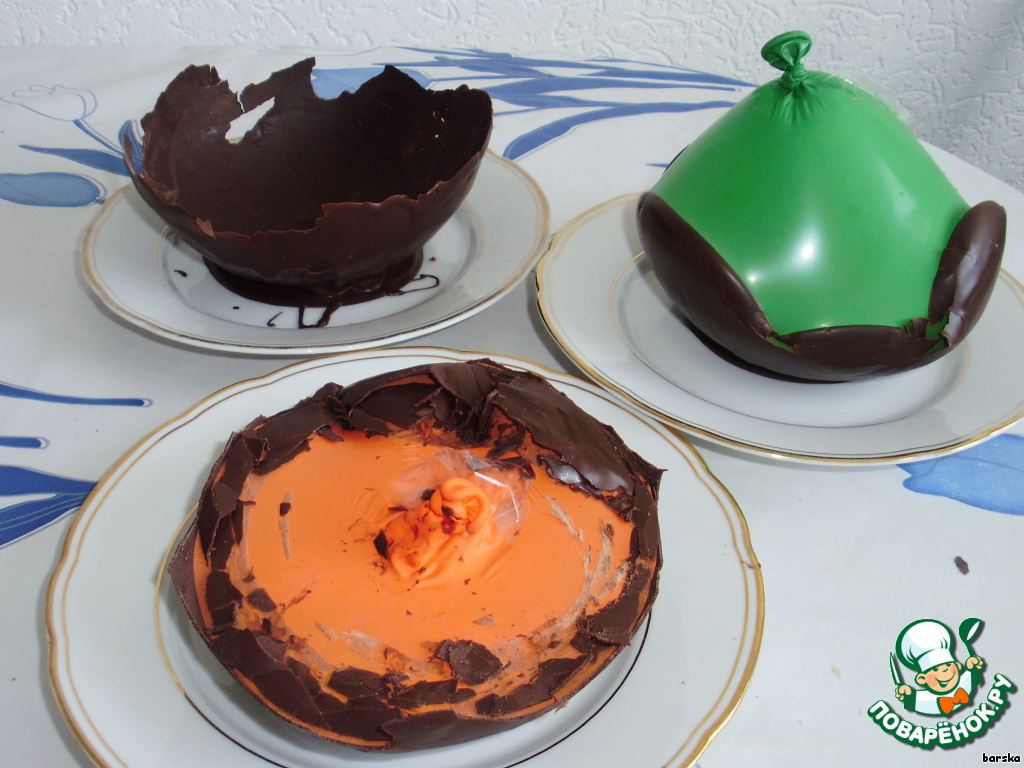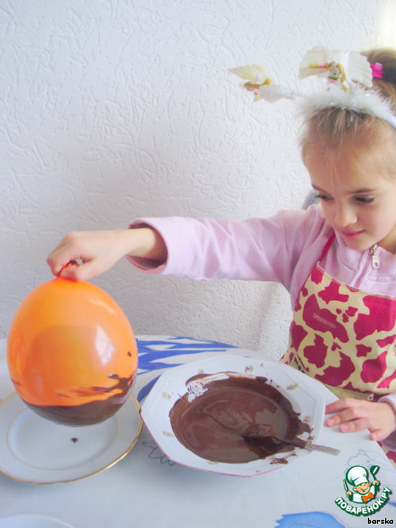 Воздушные шарики обволакиваем шоколадом, делая низ скорлупки - шоколадного яйца.