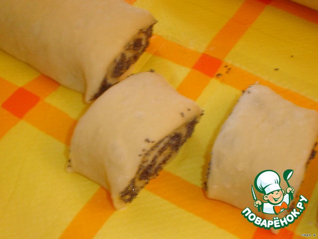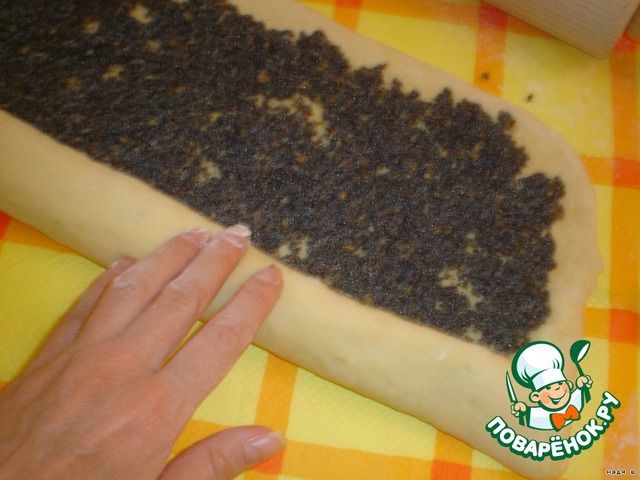 После обминки теста,выложим на поверхность,посыпанную мукой,и разомнем его(для распределения воздуха).Берем нужное количества теста (которое необходимо для булочек с маком) и раскатаем в прямоугольник.Тесто не должно быть тонким.Придется постараться на этом этапе раскатки,тесто возвращается постоянно в прежнее положение(оно очень сдобное).Выкладываем нашу начинку маковую(не доходя по 2см до краев) и сворачиваем в рулет.