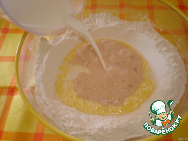Сделать лунку в муке и добавить молоко,дрожжи,яично-маслянную смесь.Замесить тесто.