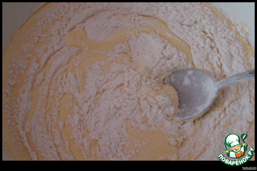 Хорошо взбить 3 яйца с сахаром, добавить муку. Аккуратно перемешать.