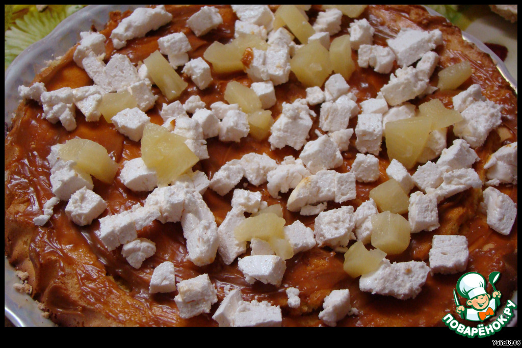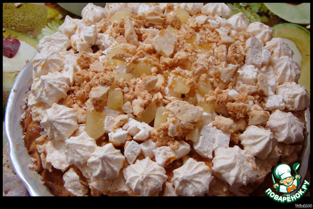 На безе выложить оставшийся крем, ананасы и остатки безе. Украсить маленькими безешками.