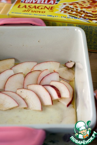 В форму налить немного соуса, положить листы лазаньи, сверху на листы снова налить соус и поверх него выложить ломтики яблок. Так чередовать, пока не закончатся яблоки.) Или листы лазаньи.)) Или соус.))) У меня закончились яблоки, и я остановилась.