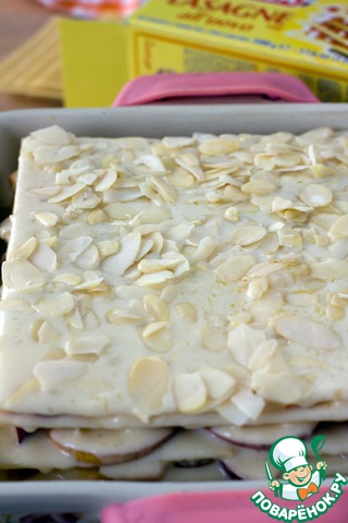 Последним идет лист лазаньи. Вылить на него оставшийся соус и посыпать лепестками миндаля. Накрыть фольгой и поставить в духовку на 35-40 минут при 190 градусах.