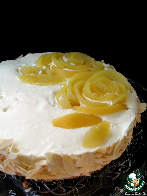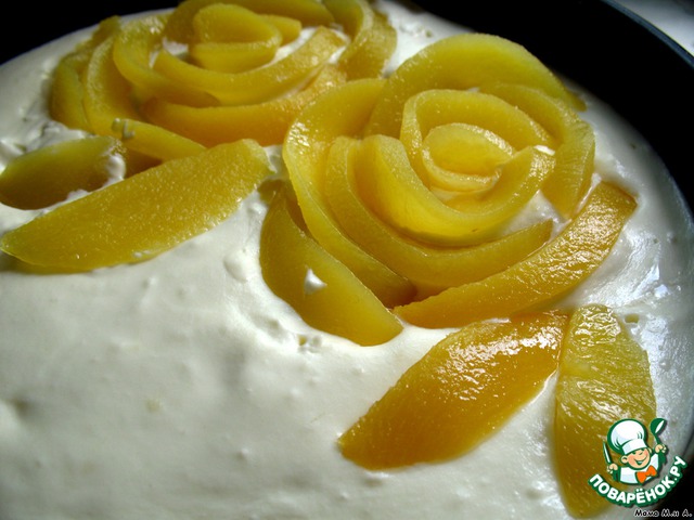 Персики порезать тонкими дольками (у меня ушло 2 половинки). Берем дольки, сворачиваем и делаем розочку, подставляя вокруг бутона пластинки персика как лепестки. Ну тут уж как вам нравится. Дольки чуть вдавливаем в застывающую поверхность.