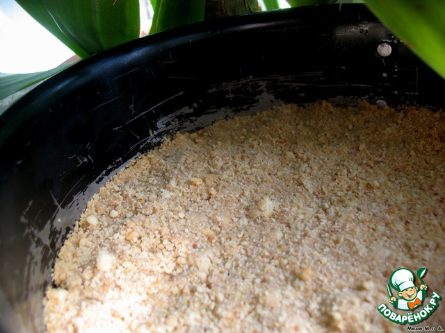 Измельчить печенье в крошку, залить растопленным маслом. Дно разъемной формы диаметром 19-20 см проложить бумагой. Плотно утрамбовать массу на дно. Далее или поместить в холодильник для застывания, или слегка, минут 10, припечь в духовке. Я припекаю.