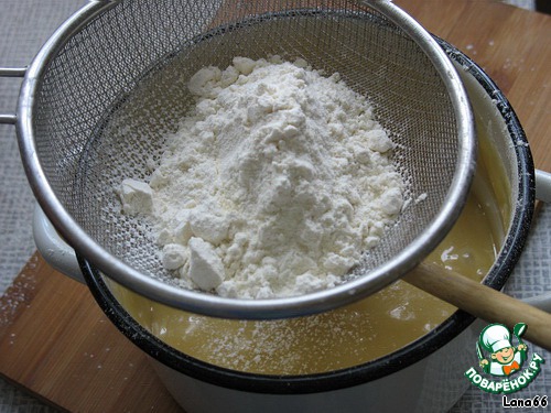 Снять с огня и в горячем состоянии всыпать просеянной муки. Тесто липнет к рукам. Так и должно быть.