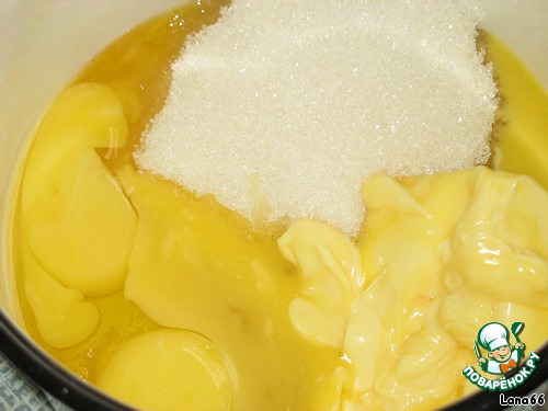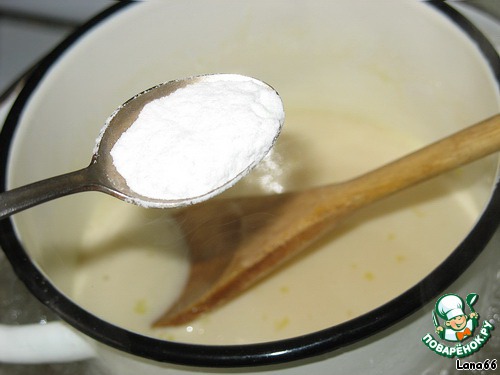 Готовим тесто для коржей. Смешать все продукты (кроме муки и соды) в небольшой кастрюльке.