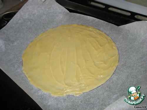 На пекарской бумаге нарисовать круг, используя кольцо от съемной формы. У меня форма 21 см.
