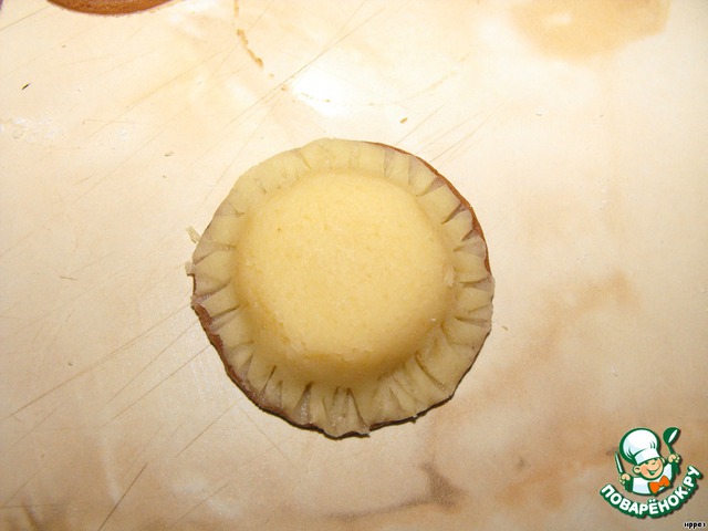 Белое тесто раскатать в тонкий пласт, стаканом выдавить кружочки.