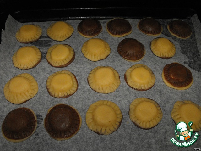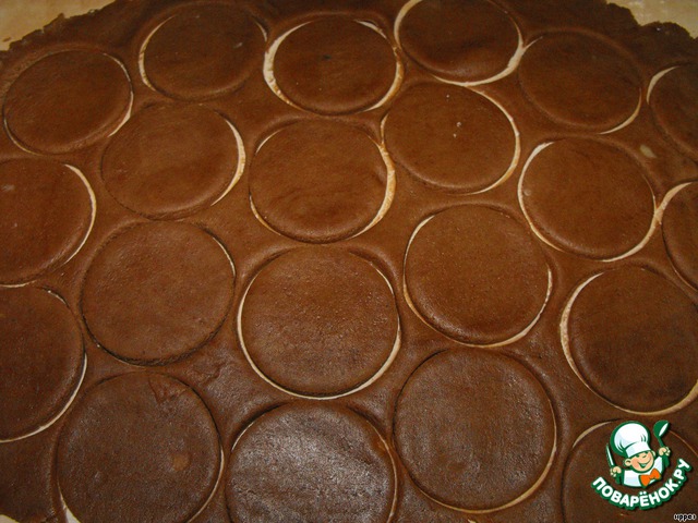 Темное тесто также раскатать в тонкий пласт, стаканом выдавить кружочки.