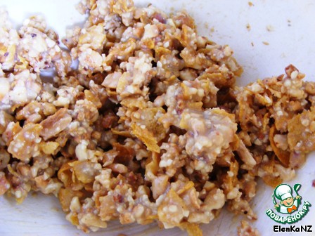 Орехи обжарить и перемолоть в блендере, но не очень мелко, добавить хлопья, сгущенку, все хорошо перемешать.