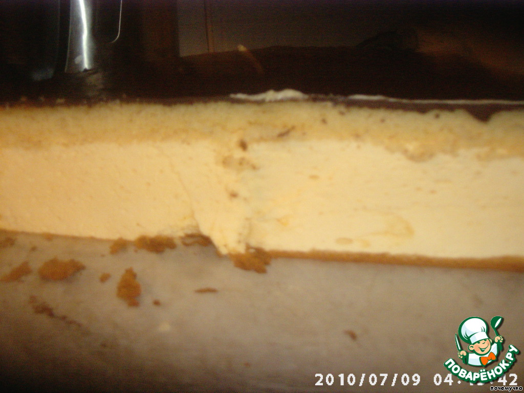 В форму уложите фольгу так, чтобы получился высокий бортик, на нее — бисквит, сверху выложите крем-суфле и опять бисквит.