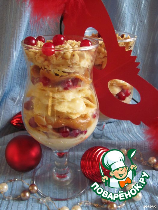 | Рецепт этого блюда был размещeн на сайте в 2010 году пользователем ksundia под названием "Десерт "Наполеон" и иллюстрирован мной в рамках акции «Раскраски». Слоеный порционный десерт - интересная подача торта "Наполеон", который в классическом варианте многим уже поднадоел. |