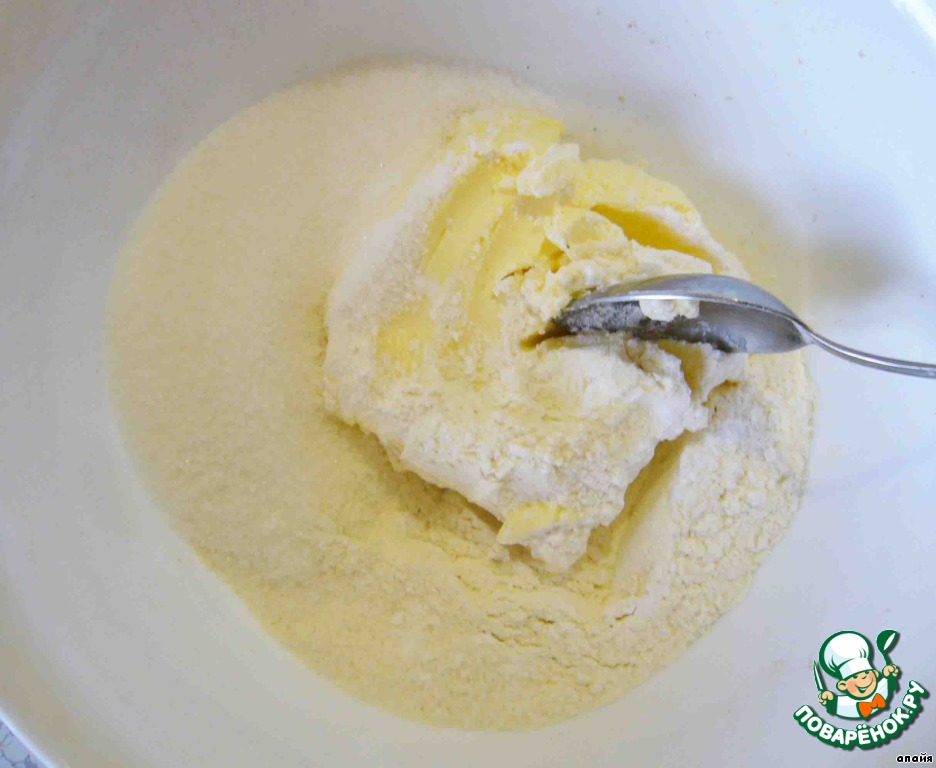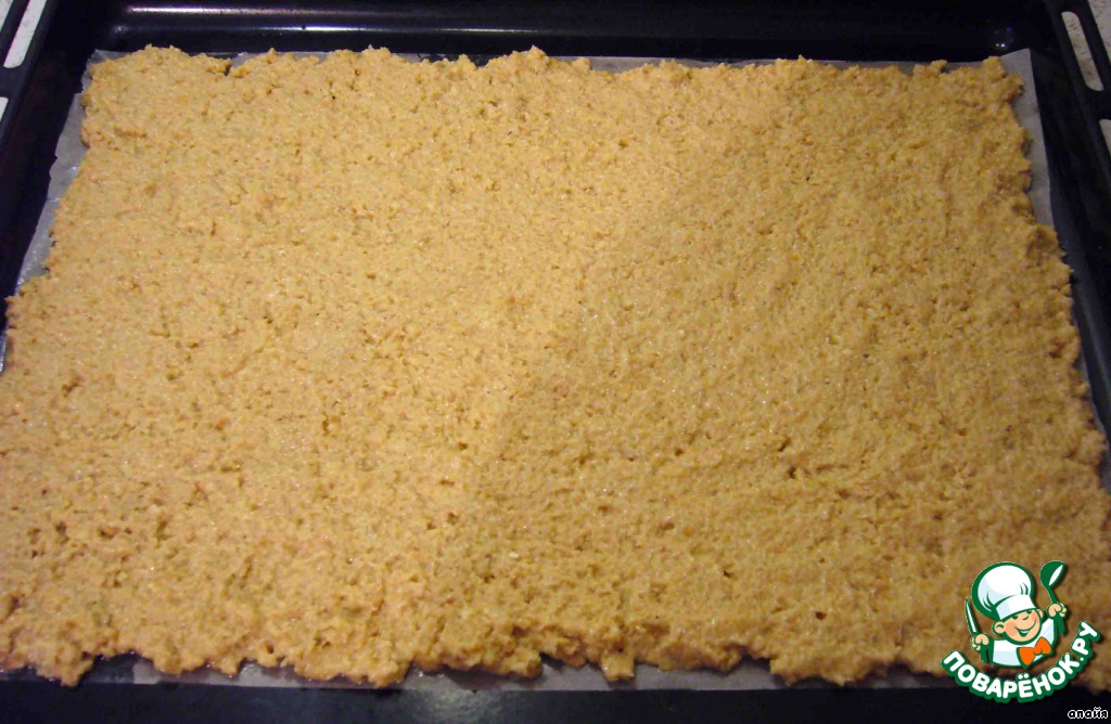 Духовку нагреваем до 190°C, противень застилаем бумагой и смазываем ее сливочным маслом. Выкладываем на противень и разравниваем готовое тесто на всю его ширину. Выпекаем 15 минут.