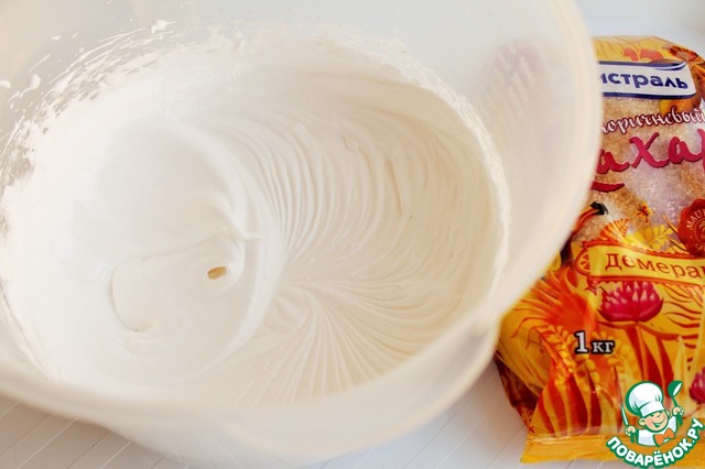 Белок взбить с 1 ст. лож сахара до мягких пик.