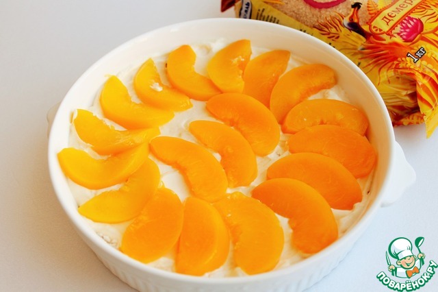 Персики порезать на дольки. На дно формы выложить первый слой меренги, сверху распределить половину крема и половину фруктов. Накрыть вторым слоем меренги и выложить оставшийся крем и фрукты.