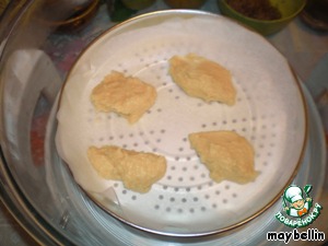 В аэрогриль ставим низкую решетку, на нее решетку для приготовления на пару. На решетку положить лист пергамента. На пергамент выложить ложкой тесто (можно выдавить кондитерским шприцом). Т.к. я экспериментировала, то положила всего лишь 4 штуки, но можно и больше за раз. Оставлять между ними много места из-за увеличения в объеме.