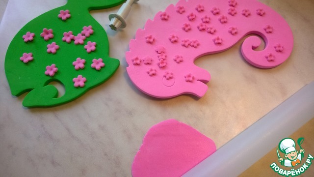 Из мастики разных цветов, при помощи плунжера делаем цветочки.