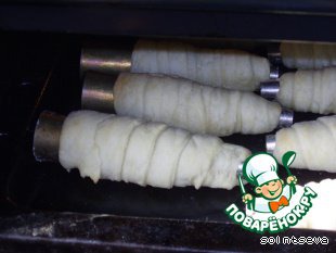 Берём металлический конус и наматываем на него в виде спиральки одну полоску теста. Получаются вот такие изделия!